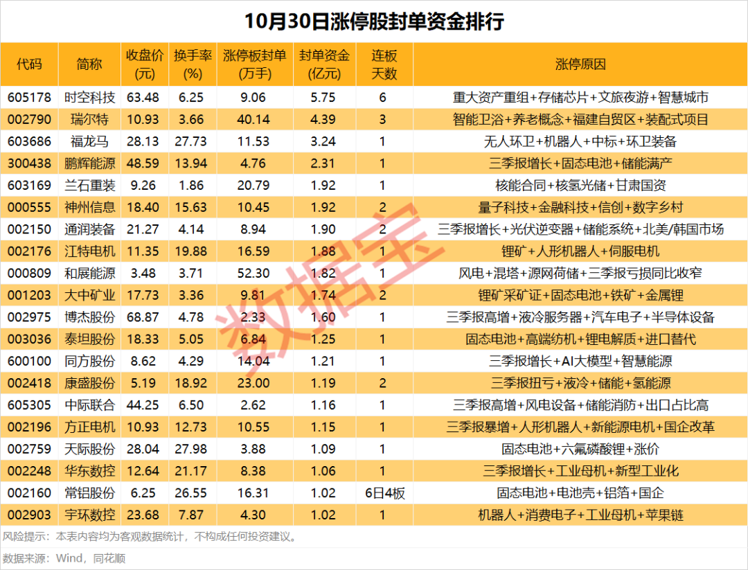 据证券时报·数据宝统计,10月30日,从收盘涨停板封单量看,和展能源居首,高达52.3万手;瑞尔特紧随其后,为40.14万手;康盛股份、兰石重装、南山控股随后,封单量均在20万手以上。