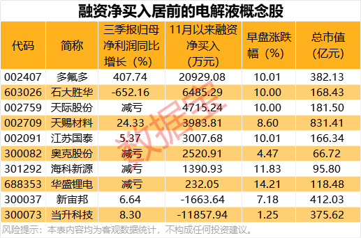 从资金面上来看,11月以来,8只电解液概念股获得融资资金加仓,多氟多、石大胜华、天际股份净买入金额居前,分别为2.09亿元、6485.29万元、4715.24万元。