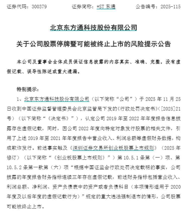 11月25日晚,*ST东通(300379)发布公告称,公司收到中国证券监督管理委员会北京监管局下发的《行政处罚决定书》,认定公司2019年至2022年年度报告信息披露存在虚假记载,同时构成欺诈发行。该行为触及《创业板股票上市规则》规定的重大违法强制退市情形,公司股票可能被终止上市。根据相关规定,公司股票自2025年11月26日起停牌。