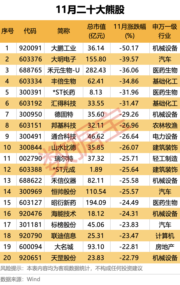 熊股方面,11月有48股跌幅超过20%。北交所股大鹏工业跌幅居首(剔除上市首日涨跌幅),为50.17%;大明电子、禾元生物-U、丰倍生物、*ST长药、汇得科技5股11月累计跌幅均超过30%。