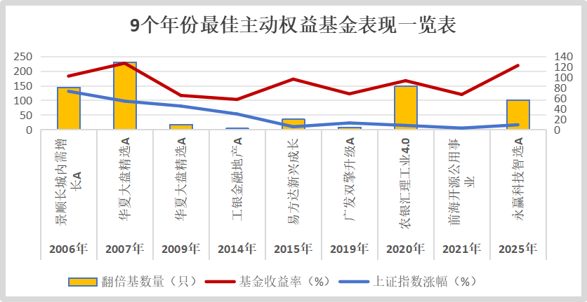 券商中国记者对比了千禧年后的9个行情年份发现,无论是2019年前的普涨行情还是此后的结构行情,主动权益基金持续大放异彩,特别2025年高仓位基金攻势越发凌猛,收益高度和翻倍基数量均在历史高位。