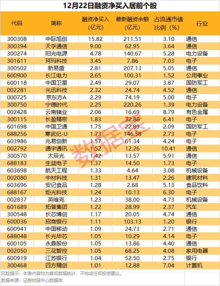 具体到个股,12月22日获融资净买入千万元以上的有550只,其中32只融资净买入额超亿元。中际旭创融资净买入额居首,当日净买入15.82亿元,其次是天孚通信、阳光电源,融资净买入金额分别为9.00亿元、4.78亿元,融资净买入金额居前的还有珂玛科技、新易盛、长江电力等。