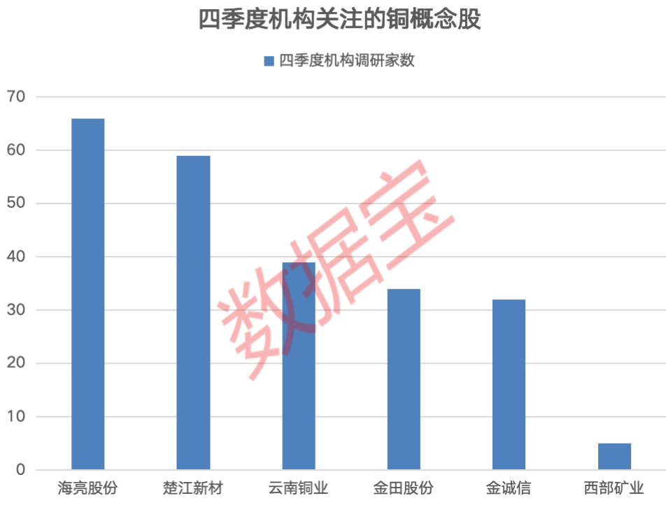 进入四季度后,多只铜概念股获得机构高度关注,6股获5家及以上机构调研,海亮股份、楚江新材、云南铜业机构调研家数居前,分别达到66家、59家、39家,多家上市公司谈到公司产品在新兴领域的拓展情况。