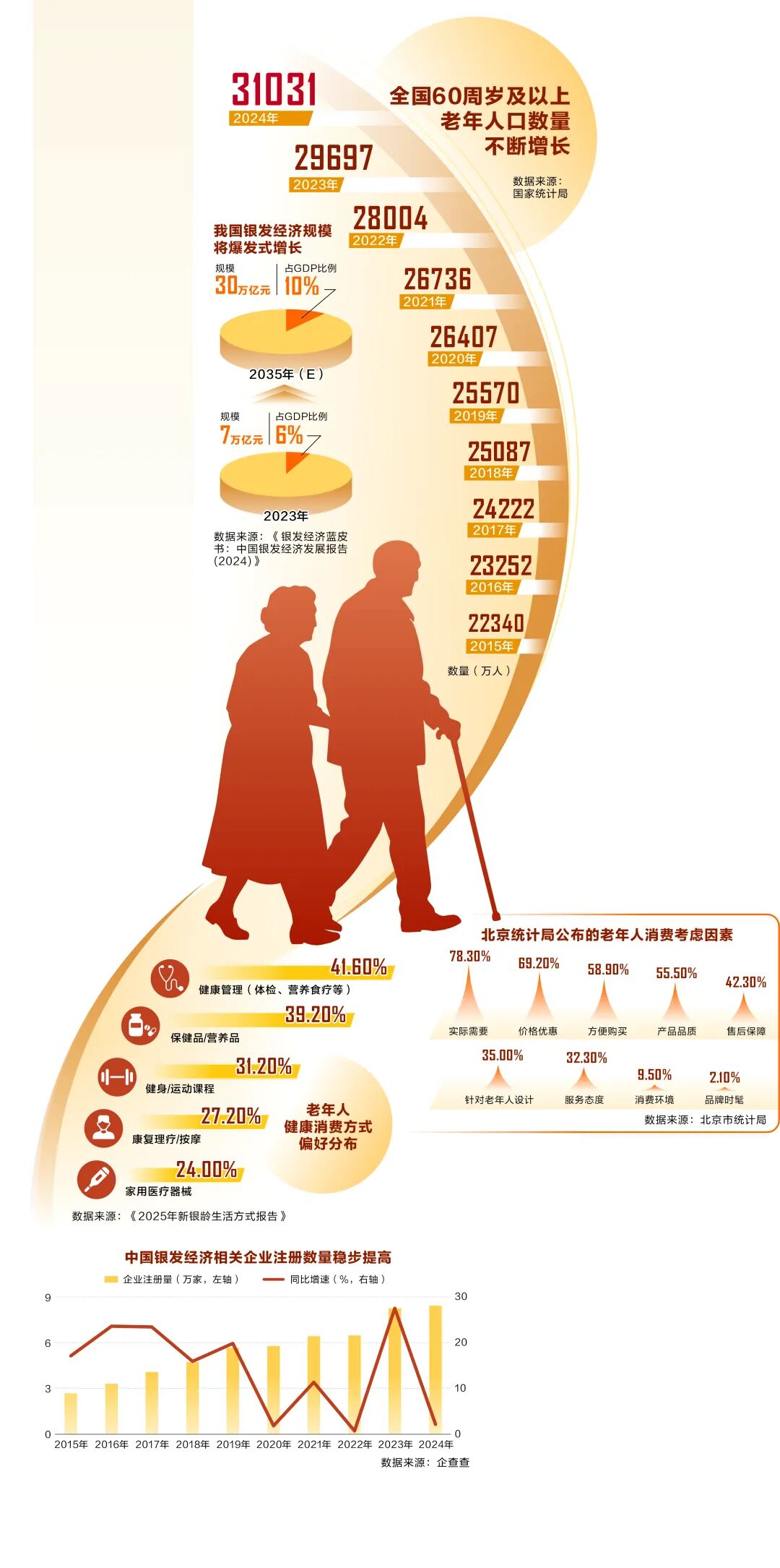 一是随着人口老龄化程度不断加深,我国已迈入中度老龄化社会。根据民政部、全国老龄办发布的《2024年度国家老龄事业发展公报》,截至2024年末,全国60周岁及以上老年人口达到31031万人,占总人口的22%;全国65周岁及以上老年人口达到22023万人,占总人口的15.6%。