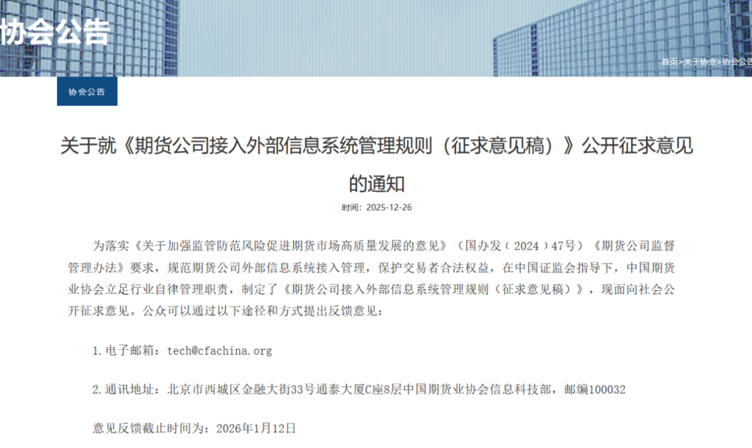 中期协表示,为落实《关于加强监管防范风险促进期货市场高质量发展的意见》(国办发﹝2024﹞47号)《期货公司监督管理办法》要求,规范期货公司外部信息系统接入管理,保护交易者合法权益,在中国证监会指导下,中国期货业协会立足行业自律管理职责,制定了《管理规则》。意见反馈截止时间为2026年1月12日。