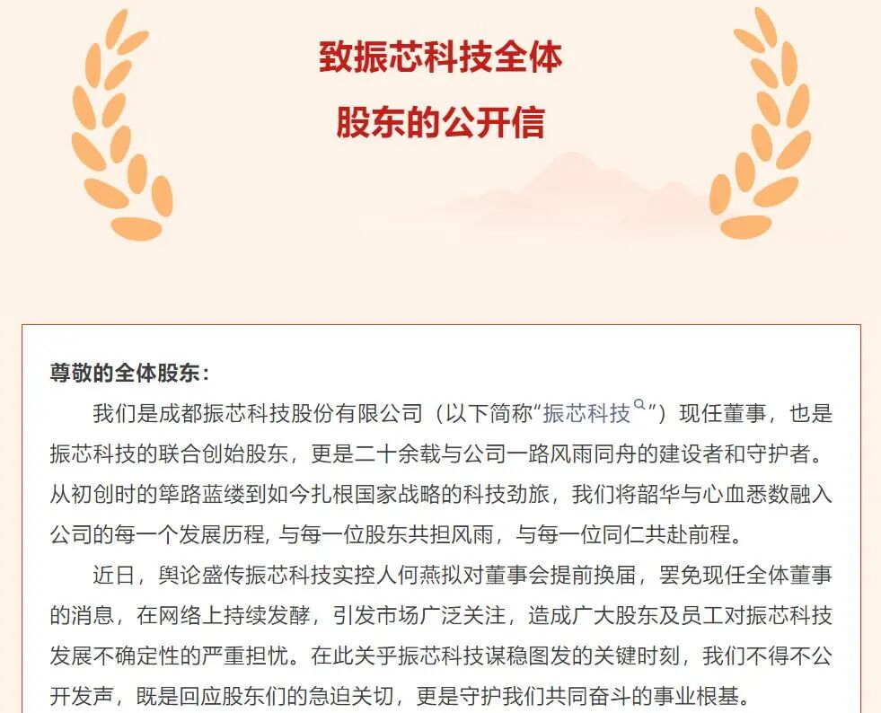 证券时报·e公司记者注意到,振芯科技微信公众号12月30日晚发布了一则《致振芯科技全体股东的公开信》。这份1600多字的公开信由公司董事长谢俊、副董事长徐进、董事柏杰署名,文中多处声讨振芯科技实际控制人何燕。