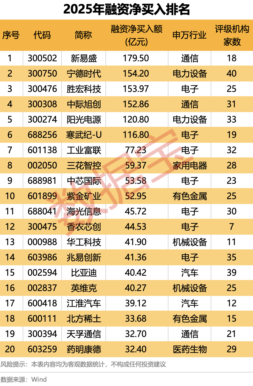 截至最新数据(12月30日),133股融资净买入额在10亿元以上。新易盛、宁德时代、胜宏科技、中际旭创、阳光电源、寒武纪-U居前,融资净买入额均在100亿元以上。