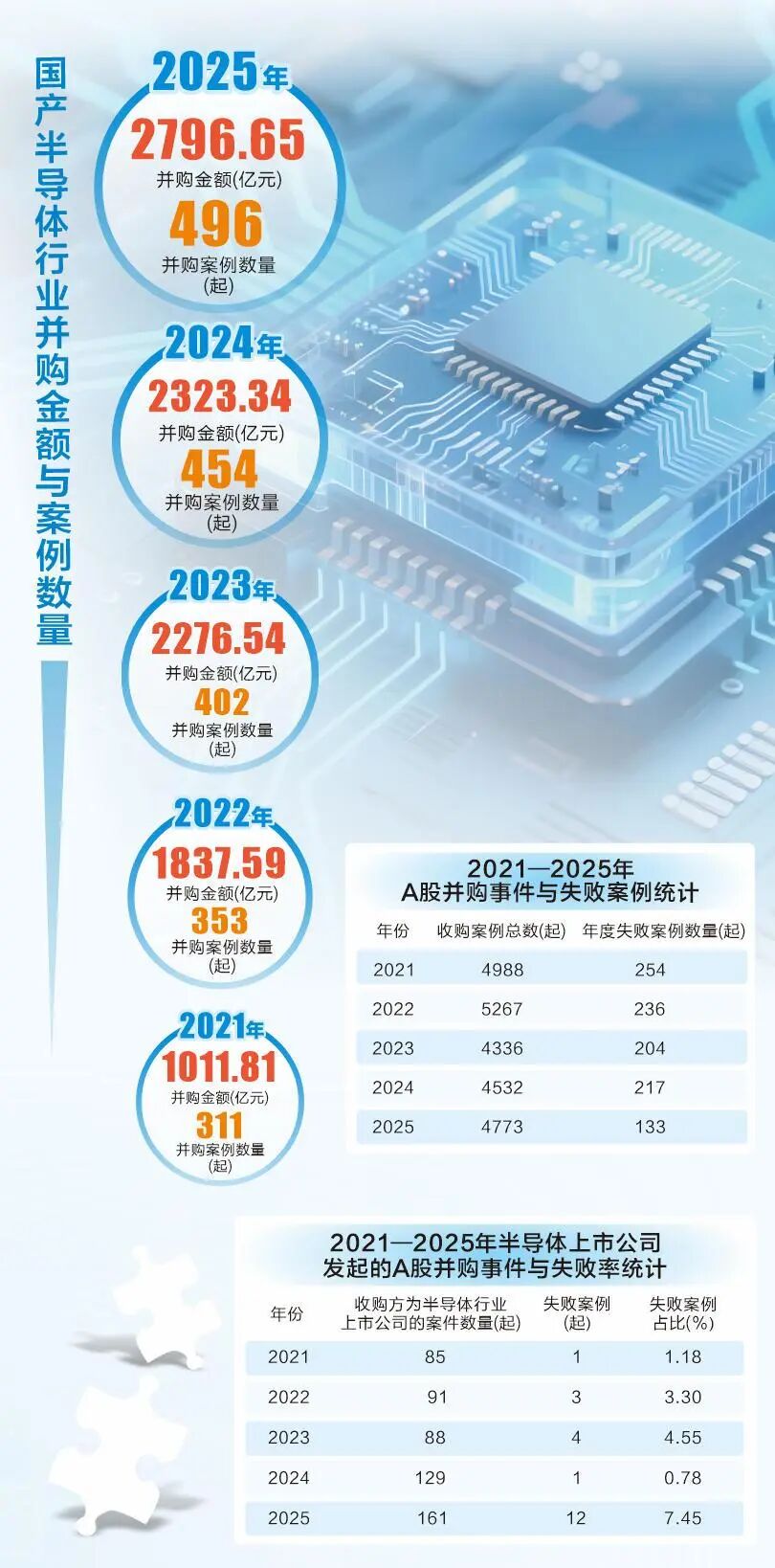 放眼整个行业,国内半导体并购活动也出现了类似情况。投中嘉川CVSource数据显示,2025年中国半导体并购金额合计达到2796.65亿元,并购案例高达496起,失败案例32起,数量同比增长超2倍,均创历史新高。