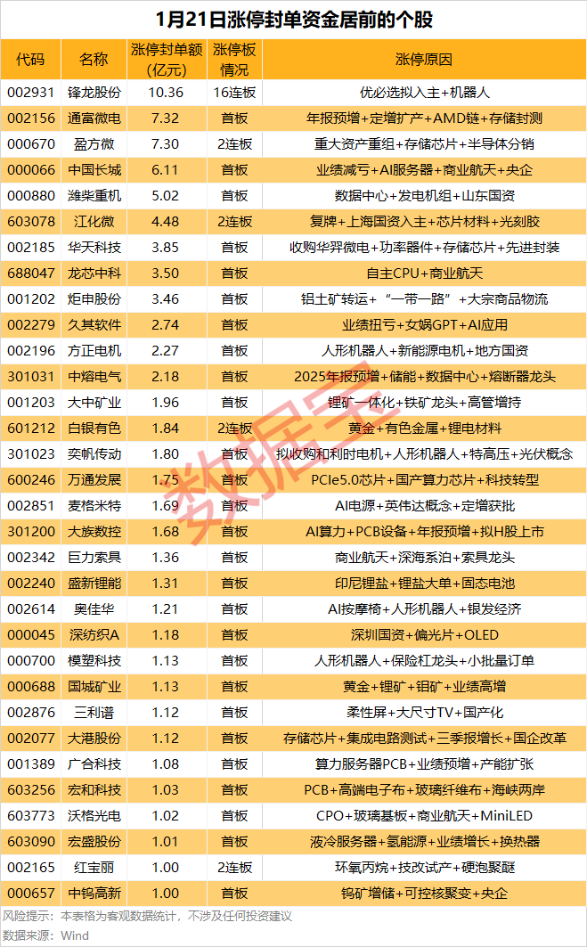 以封单金额计算,锋龙股份、通富微电、盈方微涨停板封单资金居前,分别为10.36亿元、7.32亿元、7.30亿元,后两股均涉及存储概念。此外,还有华天科技、大港股份等存储概念股封单金额居前。