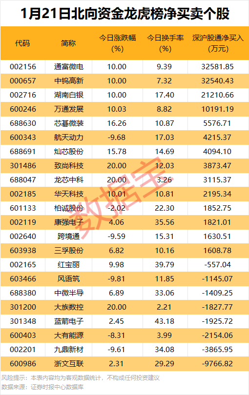 今日龙虎榜现身个股中,14股获北向资金净买入。净买入居首的是通富微电,金额为3.26亿元;中钨高新、湖南白银、万通发展等紧随其后,净买入金额分别为3.25亿元、2.12亿元、1.02亿元。