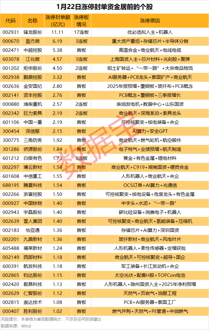 以封单金额计算,锋龙股份、盈方微、中超控股涨停板封单资金较多,分别有11.11亿元、6.19亿元、5.38亿元。