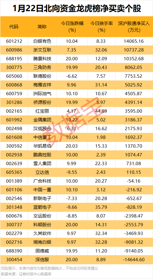今日龙虎榜现身个股中,16股获北向资金净买入。净买入居首的是白银有色,金额为1.41亿元;浙文互联、腾景科技紧随其后,净买入金额均超1亿元。