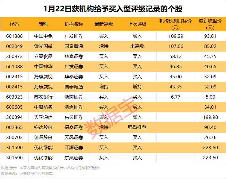 市场表现方面,机构给予买入型评级的个股今日平均上涨1.30%,表现强于沪指。股价上涨的有5只,涨停的有钧达股份。涨幅居前的有中船防务、天孚通信、中国神华,今日涨幅分别为7.49%、5.96%、1.42%。