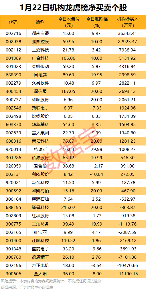 今日龙虎榜中,净买入个股有18只,净卖出的个股为12只。15股净买入金额均超千万元,湖南白银、鹏鼎控股获机构分别净买入3.63亿元、2.29亿元,居前;其次是三变科技、广合科技、奕帆传动,机构净买入金额均超4000万元。