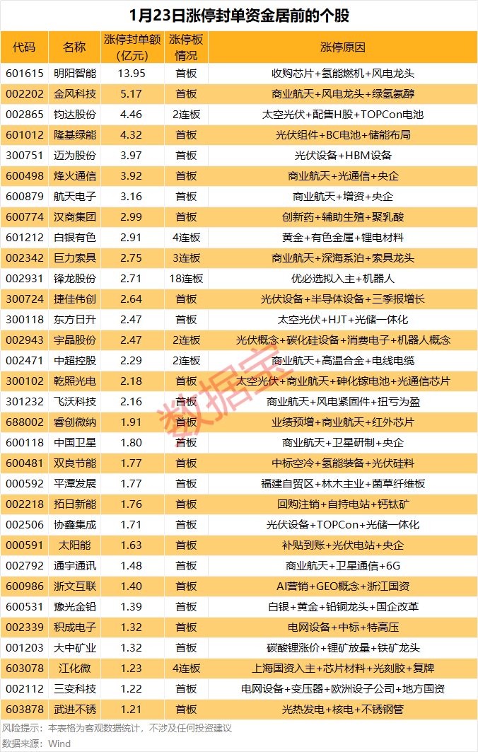 从收盘涨停板封单量来看,明阳智能最受资金追捧,收盘涨停板封单有6442.88万股;其次是协鑫集成、酒钢宏兴,涨停板封单分别有5446.90万股、4731.40万股。