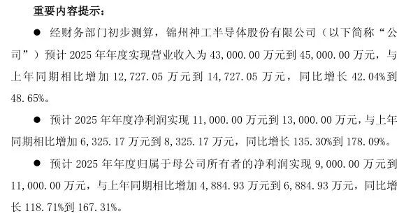 神工股份(688233)1月23日晚间公告称,预计2025年度归属于母公司所有者的净利润实现9000万元到1.1亿元,同比增长118.71%到167.31%。对于业绩变动原因,公司表示,报告期内,全球半导体市场持续回暖。其中,海外市场受到人工智能需求拉动,高端逻辑、存储芯片制造厂开工率持续提升,资本开支有所增加,带动公司大直径硅材料业务收入稳步增长;中国本土市场国产替代加速,资本开支持续增长,特别是存储芯片制造厂在技术和产能两方面紧跟全球先进水平,对关键耗材需求增加,带动公司硅零部件业务收入快速增长。