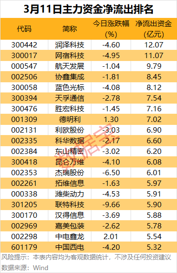 今日有70股主力资金净流出超2亿元,其中,润泽科技、网宿科技、航天发展、协鑫集成、蓝色光标、天孚通信、胜宏科技、德明利等股主力资金净流出金额居前。