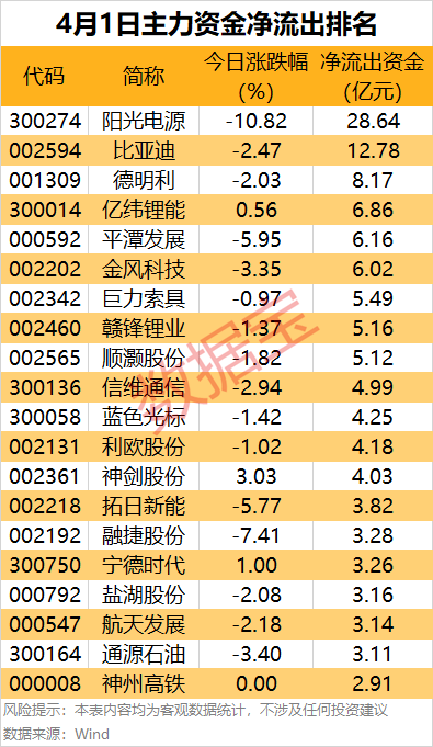 阳光电源遭主力资金连续多日净流出,今日金额达28.64亿元,股价下跌10.82%。比亚迪主力资金净流出12.78亿元;德明利、亿纬锂能、平潭发展和金风科技主力资金净流出均超6亿元,居前列。