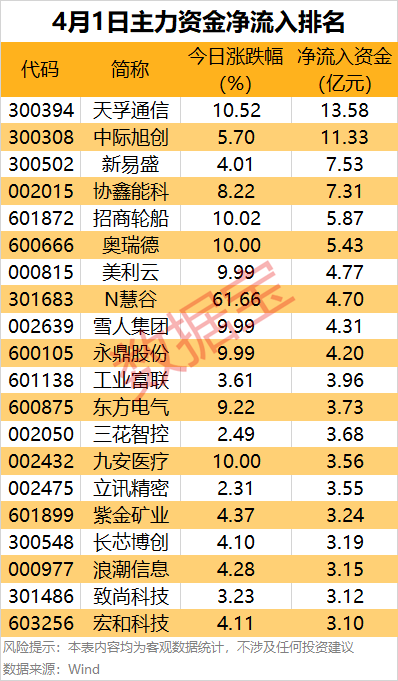 据证券时报·数据宝统计,今日(4月1日)沪深两市主力资金净流入71.94亿元,其中创业板净流入34.45亿元,沪深300成份股净流入34.27亿元。