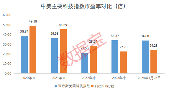 从估值来看,早在2020年末,道琼斯美国科技指数市盈率38.84倍,A股科技100指数大幅超越前者,接近50倍;2023年末,前者市盈率仅小幅下降至34倍左右,A股科技100指数市盈率仅剩22.75倍;截至2024年4月26日,道琼斯美国科技指数市盈率依然有34倍以上,A股科技100指数市盈率维持24倍左右。相比之下,A股科技板块当前估值更接近最近5年的市盈率最低值。