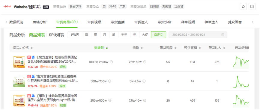 销量随之迅猛增长。娃哈哈品牌产品在抖音电商的销售额从2月25日开始飙升,到3月4日涨至顶峰,销售额达500万-750万元,相比2月25日前增长超过10倍。