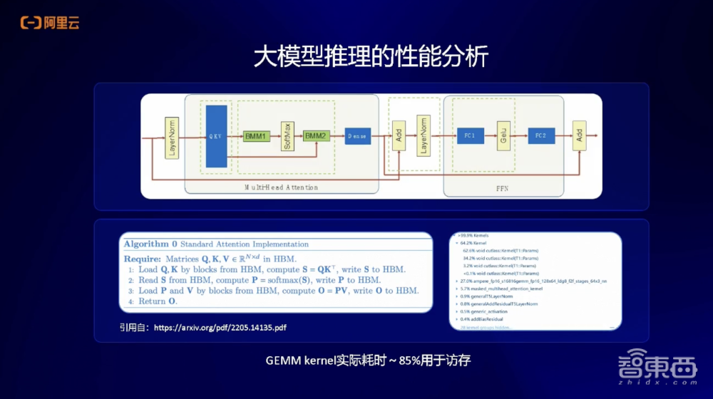 在这些算子中,我们通过微观性能分析会看到,大部分的计算都是矩阵乘操作,实际85%的耗时都是访存,进行显存读取。