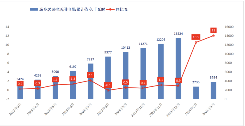 2024年1-3月,城乡居民生活用电量累计3794亿千瓦时,同比增长12%,增幅高于前两个月的10.5%。