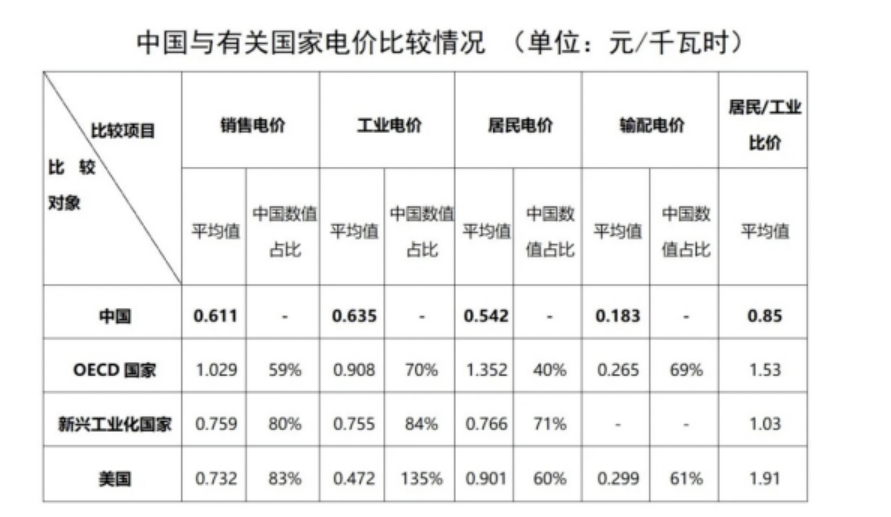 我们找了下,中国对比全球在用电成本和结构上的差异。