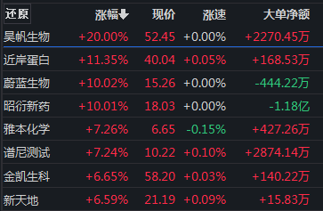 此外,CRO(医药研发服务外包)概念盘中拉升,全天维持涨幅,昊帆生物、蔚蓝生物、昭衍新药涨停,金凯生科、万邦医药、海特生物、药明康德等涨幅居前。
