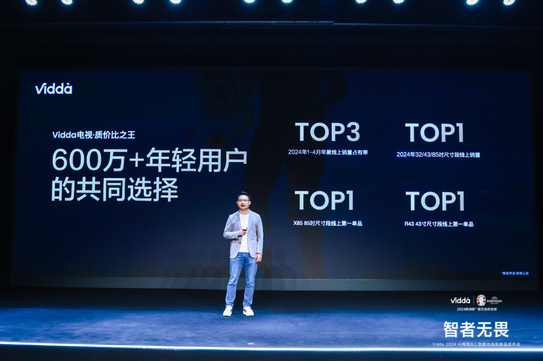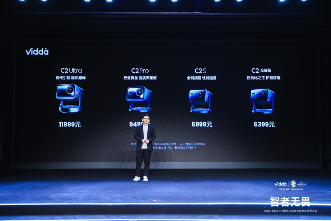 5月8日,智者无畏-Vidda 2024 AI电视&三色激光投影新品发布会在北京召开,发布了2024欧洲杯官方指定智能投影——三色激光投影C2系列“全家桶”,2024欧洲杯官方指定互联网电视X Ultra系列,以及自研AI美声麦克风V3、V7。