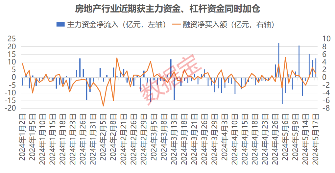 政策的持续加码,为行业注入“强心剂”,也极大增强了投资者的信心。从房地产行业持续反弹开始,多路资金持续净流入行业个股。据数据宝统计,自4月25日开始,主力资金累计净流入A股房地产行业达到48.84亿元,其中4月29日、5月10日净流入超过20亿元,而年初至4月24日净流出172.1亿元,主力资金回流明显。