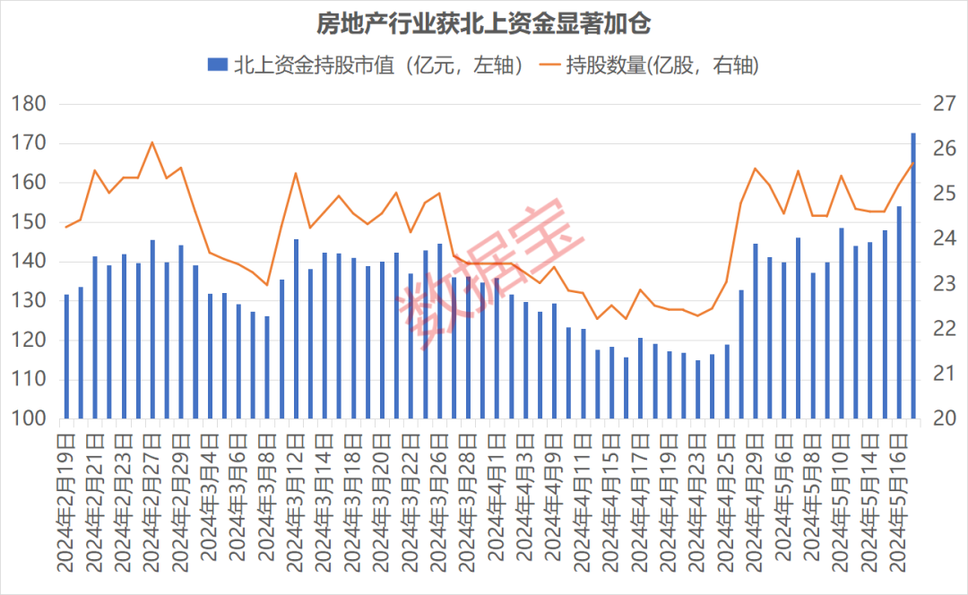 房地产行业的成交活跃也吸引了外资,数据显示,4月25日以来,房地产行业个股获陆股通持股数量明显上升,最新达到25.68亿股,较年内低点增长了15.57%。行业龙头多次进入北上资金前十大活跃个股榜单中,如保利发展5月17日获北上资金净买入超5亿元。