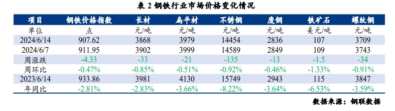 6月14日,钢铁价格指数907.62,周环比下降4.33,降幅0.47%;年同比下降26.23,降幅2.81%。