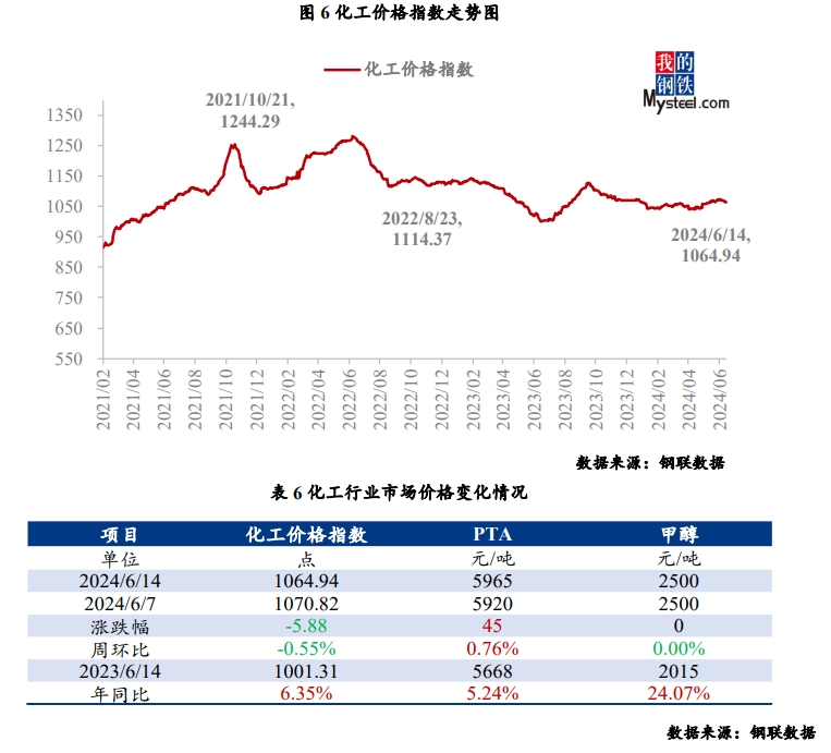 6月14日,基础化工价格指数1064.94,周环比下降5.88,降幅0.55%;年同比上升63.63,涨幅6.35%。