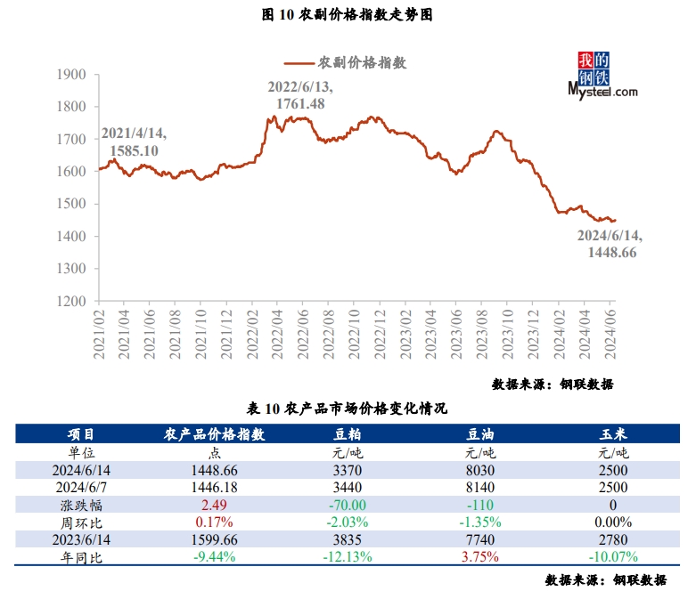 6月14日,农副产品价格指数1448.66,周环比上升2.49,涨幅0.17%;年同比下降150.99,降幅9.44%。
