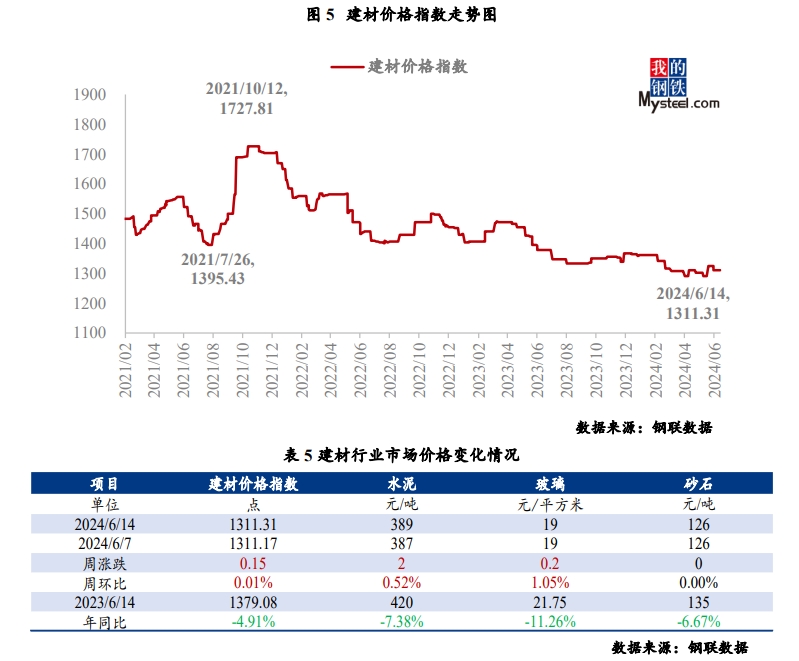 6月14日,建材价格指数1311.31,周环比上升0.15,涨幅0.01%;年同比下降67.77,降幅4.91%。