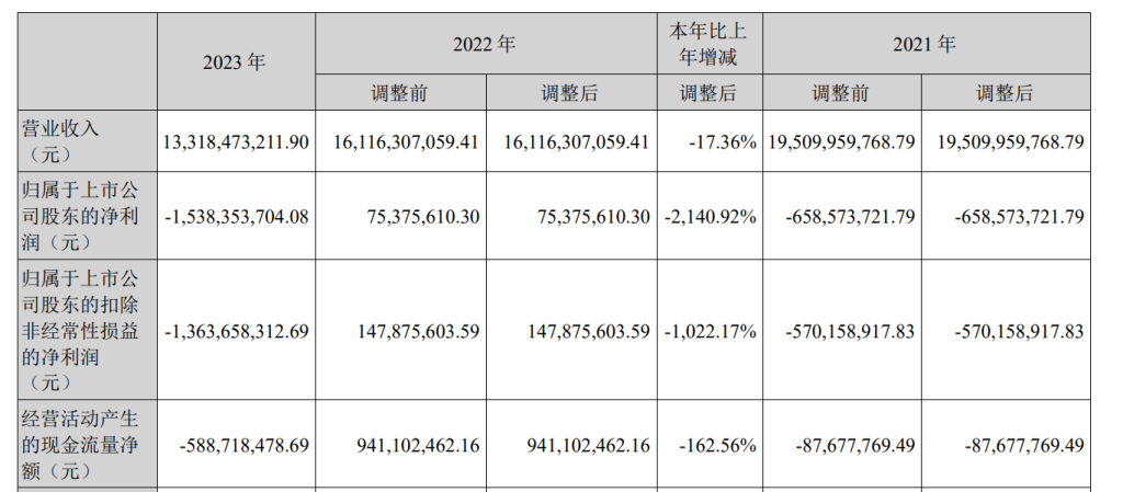 财报显示,2023年公司实现营业收入133.18亿元,同比下降17.36%;净利润亏损15.38亿元,相比上一年同期下滑2140.92%。业绩亏损同样出现在龙大美食2023年上半年财报中。根据财报,龙大美食2023年上半年亏损6.243亿元,2023年前三季度亏损6.485亿元。
