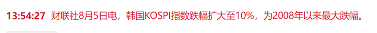 8月5日,全球股市抛售加深,日经225指数收盘重挫12.4%;韩国KOSPI指数跌幅扩大至10%,为2008年以来最大跌幅;台湾证交所加权股价指数收跌8.4% 为历史最大单日跌幅。美股期指跌幅持续扩大,纳指期货跌幅扩大至5%。