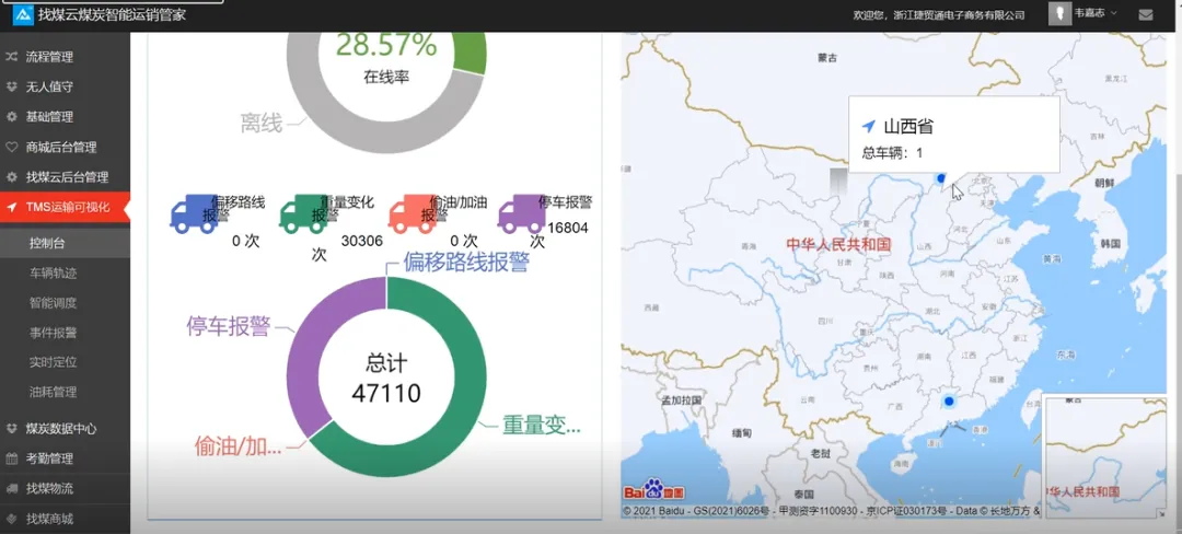 对车辆、司机、线路调度、油耗、车载等在线管理,对货物安全动态监管及运输轨迹监测。