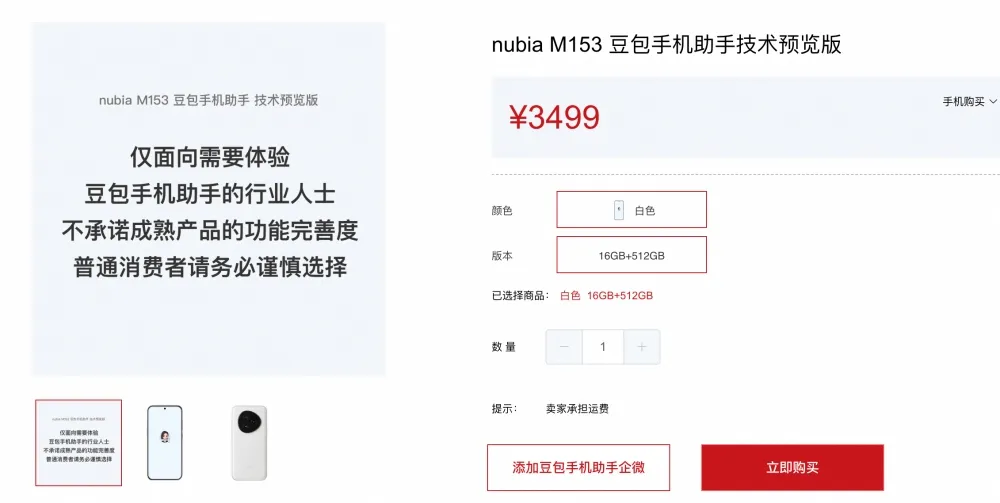 12月1日,字节跳动发布豆包手机助手技术预览版并发售少量AI工程样机,该样机硬件由中兴通讯NubiaM153支持,售价3499元,采用6.78英寸LTPO屏幕,搭载高通骁龙8至尊版移动平台,具备16GB内存、512GB存储。