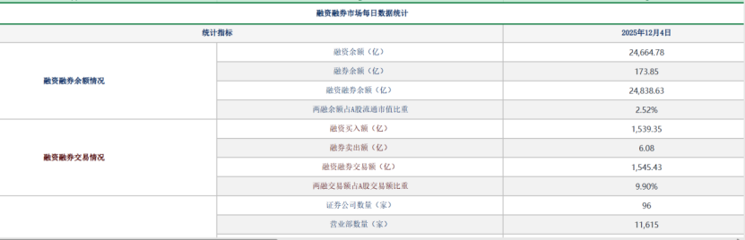 不过,中证数据有限责任公司最新动态数据显示,进入12月后两融余额已有回稳迹象。截至12月4日,A股融资余额为24838.63亿元,较11末略有回升;当前两融余额占A股流通市值比例为2.52%,整体杠杆水平仍处于稳健区间。