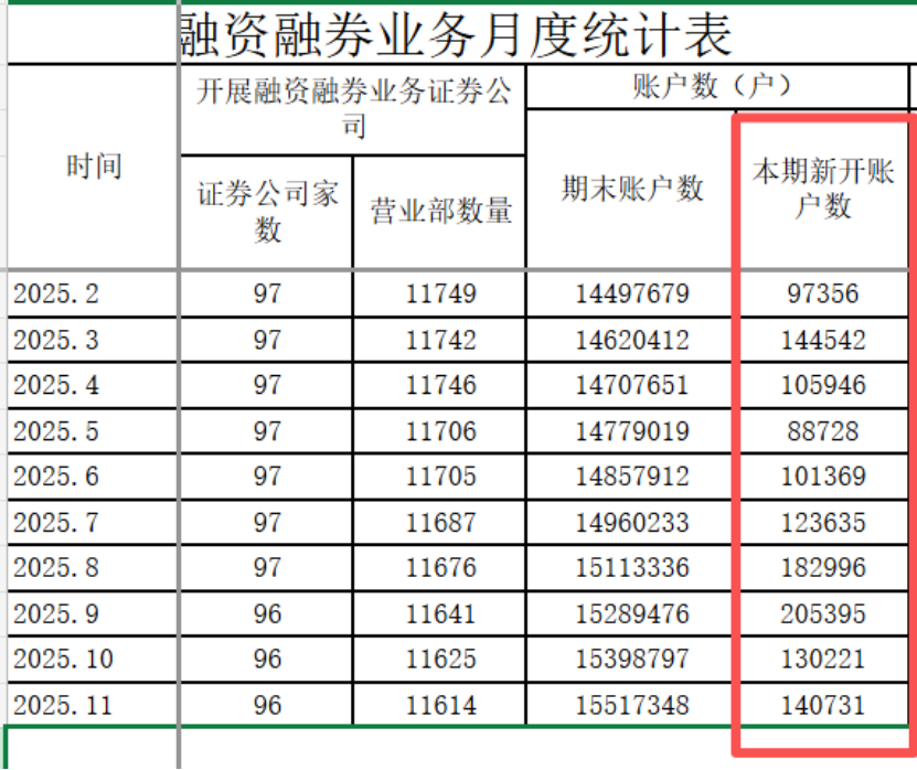 从2025年的月度数据明细来看,两融新开户数呈现明显的起伏:1月新开7万户;2月升至9.74万户;3月达到一个小高峰14.45万户;4月回落至10.59万户;5月进一步降至8.87万户;6月回升至10.14万户;7月继续增长至12.36万户;8月大幅跃升至18.3万户;9月则达到年内迄今的高点20.54万户,10月的回落至13.02万户,可视作在连续两个月高增长后的正常调整,而11月则反弹至14.07万户,整体仍处于今年以来中高位水平。