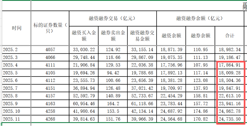 值得留意的是,今年4月至10月期间,两融余额曾连续七个月保持增长,从4月末的17864.91亿元一路攀升至10月末的24862.78亿元。11月的小幅回调,是半年以来首次月度下降。