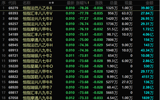 在A股表现尚可的背景之下,港股市场连续两个交易日杀跌。12月9日午后,香港恒生指数跌幅扩大至1%,恒生科技指数跌幅扩大至2%。与此同时,恒指牛证出现大面积巨幅杀跌,恒指法兴八七牛U大跌超77%,成交过百万港元的恒指汇丰八十牛V、恒指摩通八九牛K等跌幅都超过了74%。