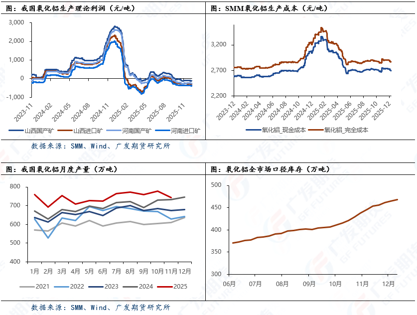 当前供应端压力持续,尽管山西与贵州地区部分企业因检修导致周度开工率与产量有所下滑,但国内运行产能整体仍维持高位,且进口窗口保持开启,后续仍有进口货源流入预期。与此同时,全国氧化铝显性库存持续累积,高库存格局对价格压制明显。成本端,铝土矿原料价格因进口量大幅增长而持续承压下行,导致氧化铝现金成本支撑位同步下移。综合来看,氧化铝供应过剩格局未变,预计价格将维持底部震荡,主力合约短期参考区间下移至2450-2700元/吨,需注意资金减仓主动止盈带来的情绪性反弹。市场能否走出有效反弹行情,关键在于观察现有企业实际减产规模以及库存是否出现明确拐点。