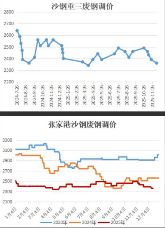 沙钢自12月11日起废钢下调30/吨,调整后车运执行价重三含税下降至2360元)吨,创8个月新低,较去年同期下降200元/吨。