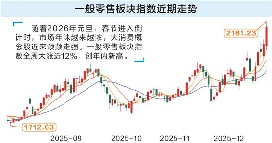 市场热点方面,随着2026年元旦、春节进入倒计时,市场年味越来越浓,大消费概念股近来频频走强。一般零售板块指数全周大涨近12%,创年内新高。百大集团7日6涨停,股价创10年来新高;利群股份4日3涨停,上海九百连续2日涨停,中央商场、永辉超市、茂业商业等近期也多次涨停。
