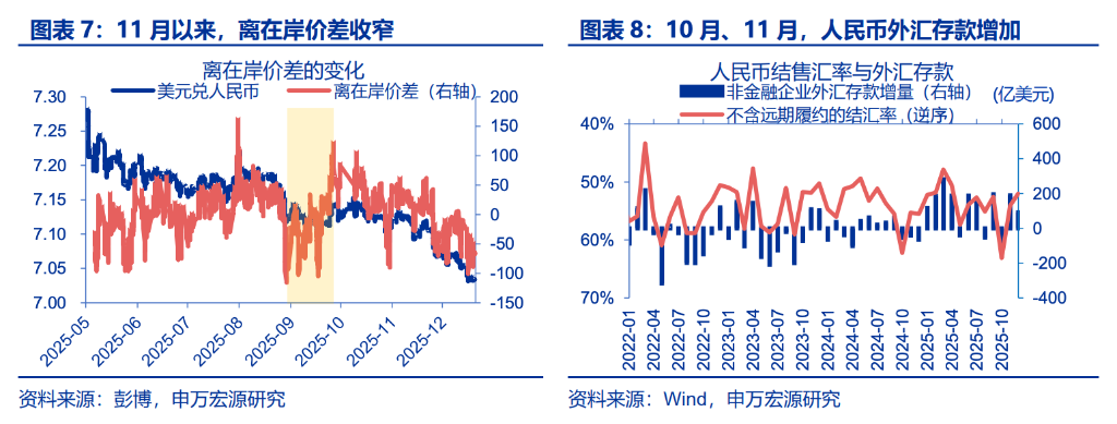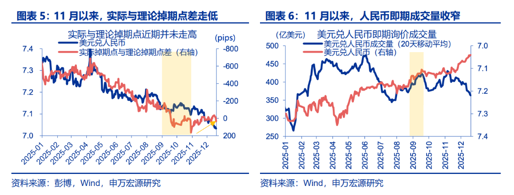 此外,多项高频市场指标也佐证了这一判断。若真有大规模结汇资金涌入,外汇市场通常应出现掉期点走高、离在岸价差扩大、即期成交量放大的特征。但实际情况恰恰相反:相关掉期点差持续收窄、人民币成交量萎缩、离在岸价差并未走阔。这些微观信号显示,10月下旬至11月的升值,与央行逆周期调节因子的引导密切相关;而12月以来的走势,则与美元指数自身的疲软表现出更高的同步性。