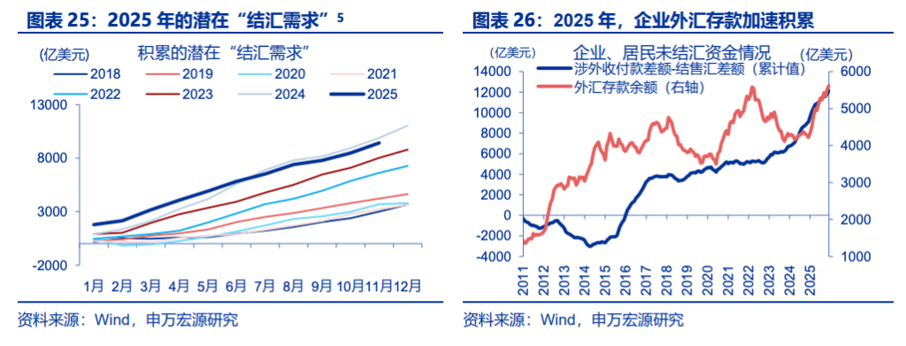 春节时点影响结汇峰值出现时间。在2月过春节的年份,结汇率大幅改善会后移至次年1月;而1月春节的年份,结汇高峰则在12月。2026年春节为2月,意味着结汇改善可能延续至1月。
