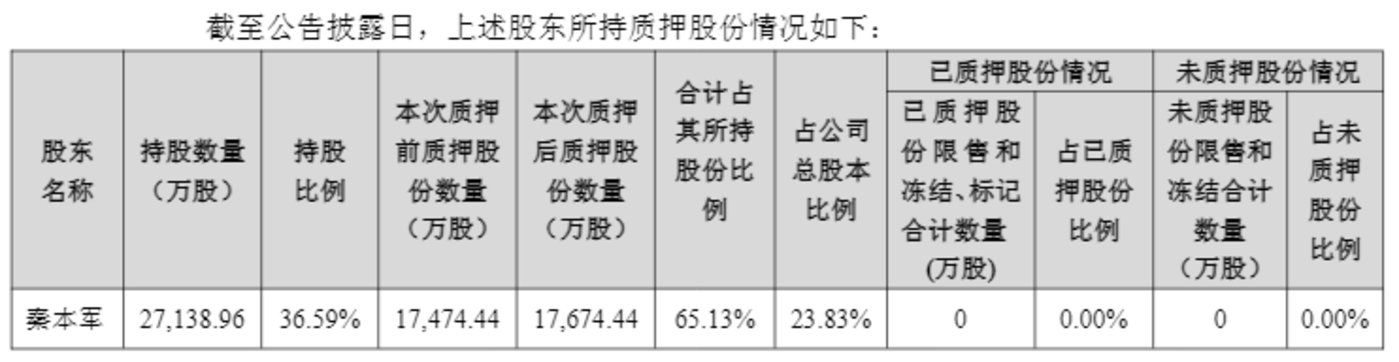 资金压力成为压垮骆驼的最后一根稻草。近年来,秦本军的股权质押比例持续高企,截至最新披露,其累计质押股份约1.767亿股,质押比例高达65.13%,占公司总股本的23.83%,按停牌前收盘价计算,质押股份市值约15.2亿元。到2026年4月左右,秦本军约1.61亿股质押股份将集中到期,占其全部质押股份的91%,集中兑付压力凸显。